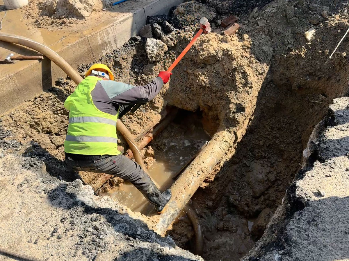 下午時分,漏點終于現(xiàn)身。在三米深的坑底,一根DN1000玻璃鋼管的側方和下方,出現(xiàn)了兩處破損。