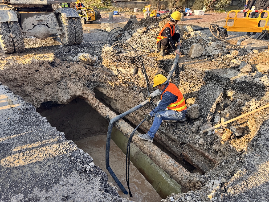 這次搶修難點重重,管道埋深大、尋找漏點耗時、抽排積水費時、周邊管線復雜制約機械使用、寒冷天氣影響修復材料固化……每一個難點,都被這支搶修隊伍用專業(yè)、經(jīng)驗和毅力一一攻克。